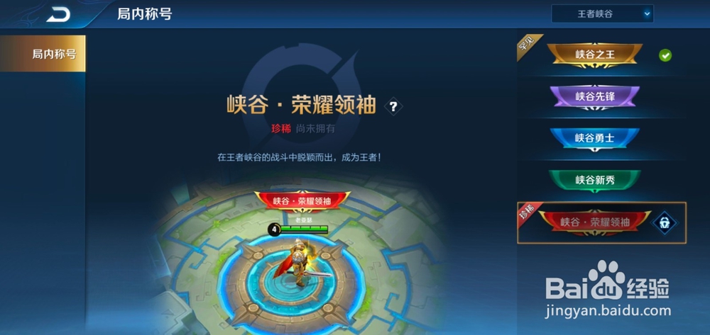 最后获得了珍稀称号峡谷荣耀领袖后,可以进行佩戴,显示我们的实力与荣耀。
