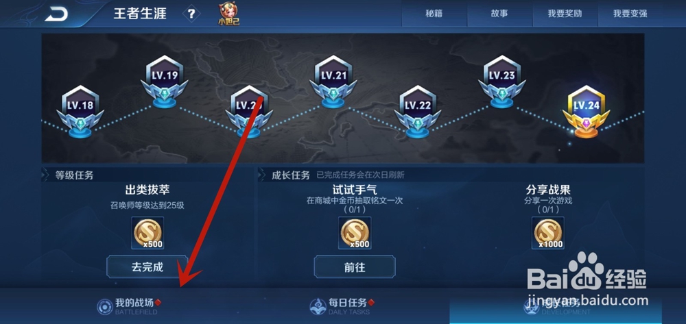 然后在打开的王者生涯界面,点击左下方的【我的战场】选项,如图所示。