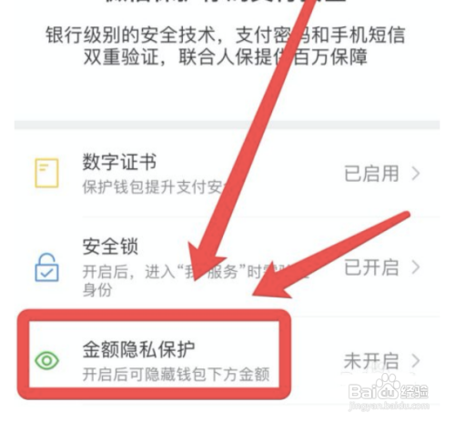 在安全保障窗口,找到【金额隐私保护】功能页面。