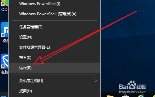 右键点击屏幕左下角的开始按钮,在弹出菜单中选择运行菜单项肥酱柱。