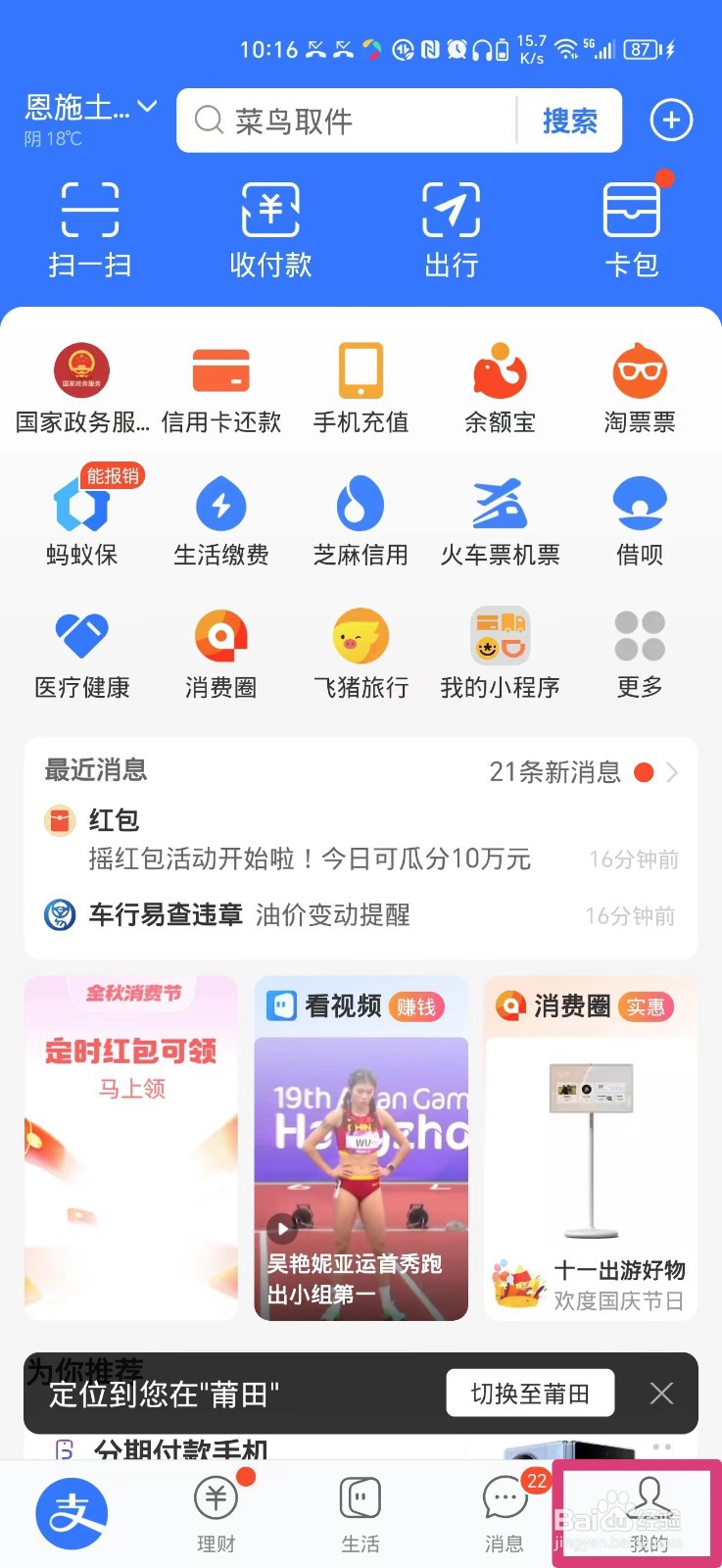 第一步:打开支付宝,点击右下角的我的