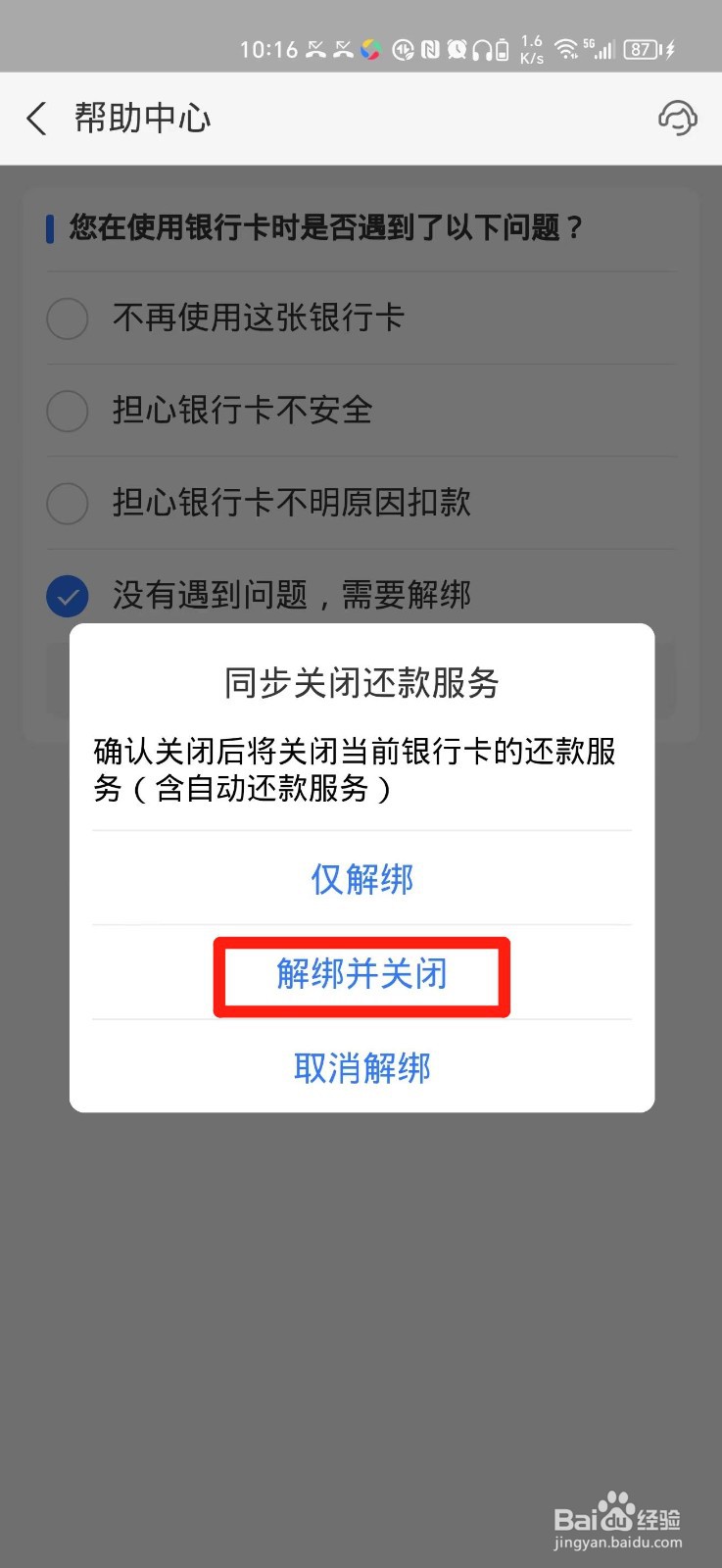 第八步:最后点击页面上的【解绑并关闭】即可删除信用卡