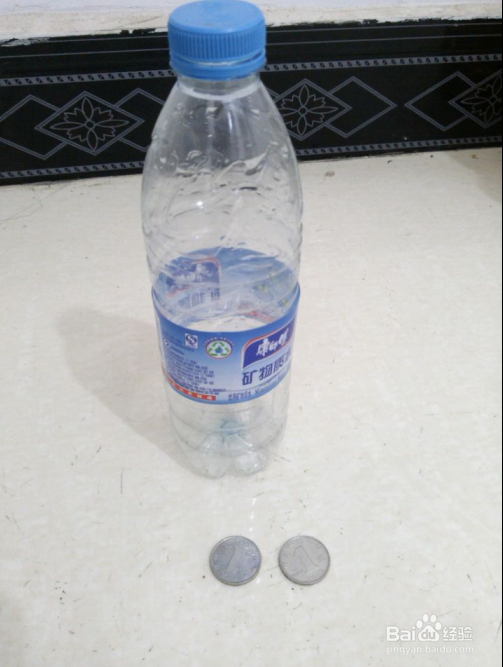 准备好矿泉水瓶1个、1元硬币2个,尽量使在桌子后面表演,或其他遮挡物也可以。