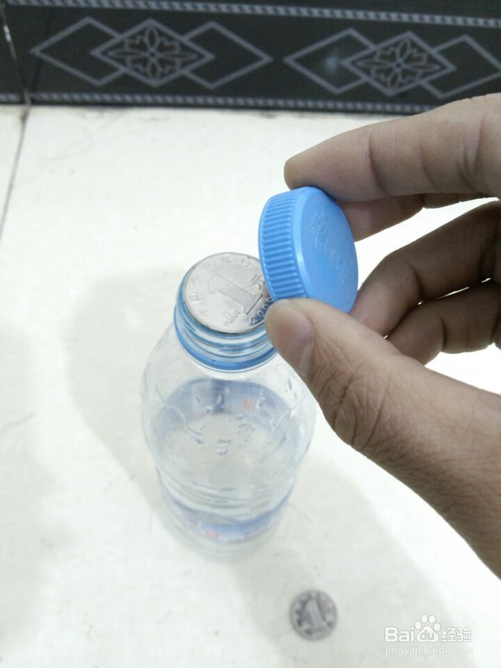 将其中的1个硬币放到瓶子口上,不要让硬币掉下去,再盖好盖子,准备表演。