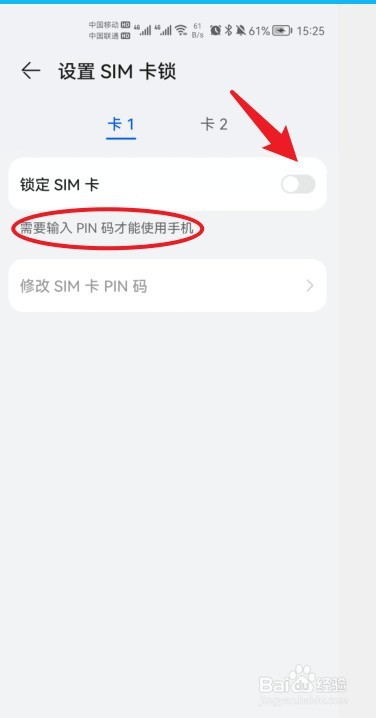 输入PIN码,将【锁定SIM卡】右侧的开关打开即可。
