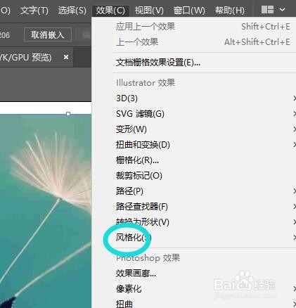 在Illustrator中选中画板中的图片,然后打开效果菜单