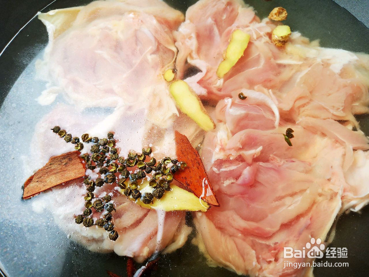 去骨后的鸡腿肉,冷水下锅煮,加入一块桂皮,2个八角,适量花椒,一勺料酒,适量姜片和葱段煮一下。