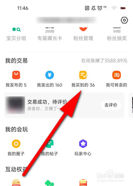 第二步:在闲鱼个人主页中心界面选择【我买到的】宝贝,点击打开。