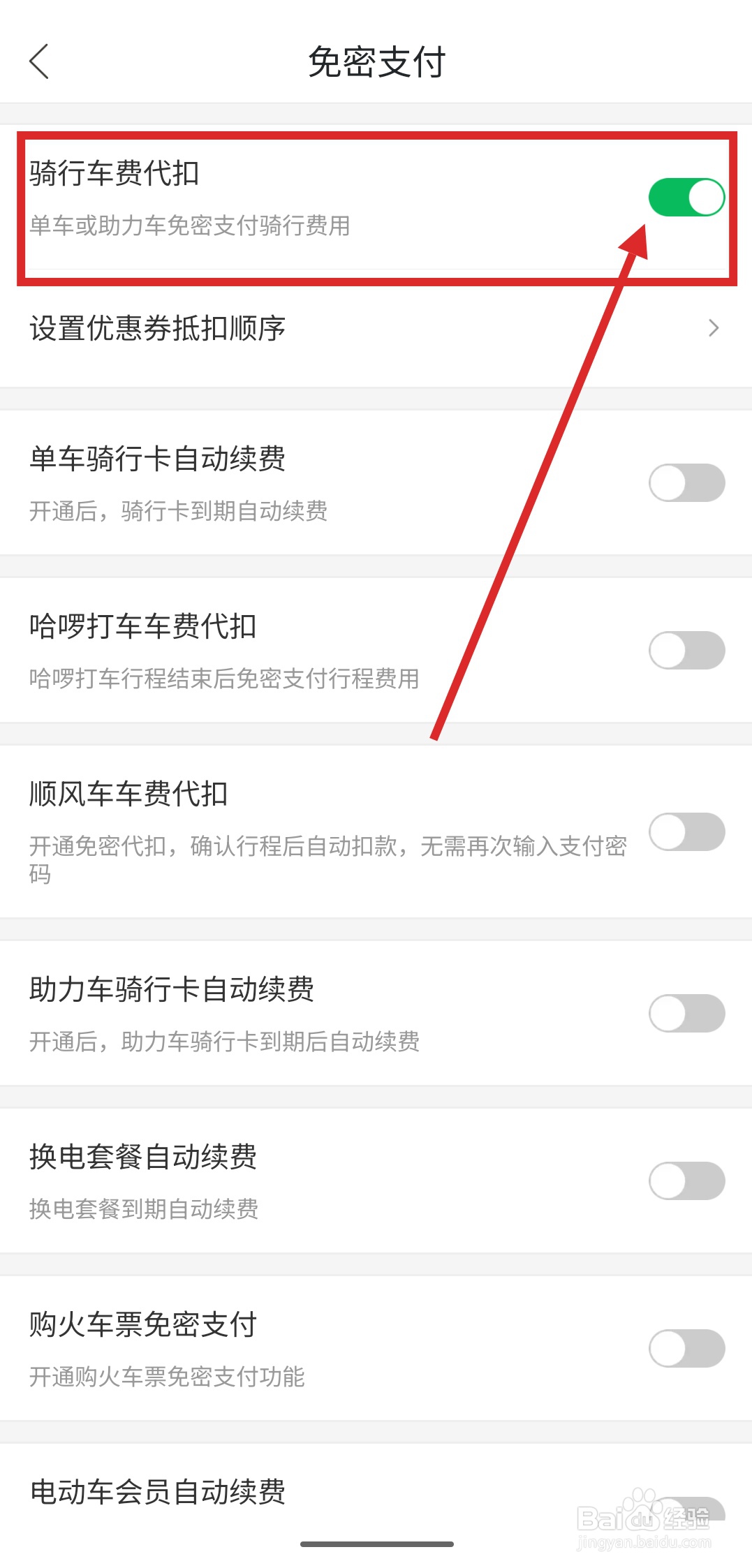 打开“骑行车费代扣”选项的开关,就可以免密支付骑行车费。