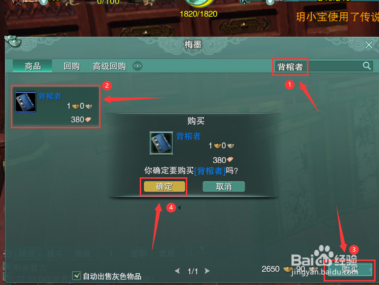 最后,在交易框界面的搜索框中输入【背棺者】,选中搜索出来的【背棺者】,点击交易框界面的【购买】按钮并在弹出的购买确定框中点击【确定】按钮,这样,我们就获得了想要的书籍【背棺者】啦。