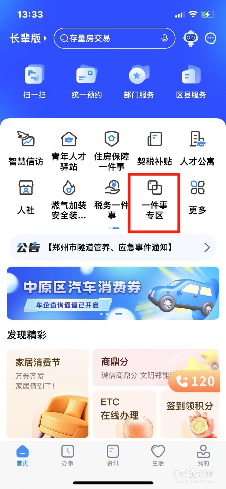 第一步:打开【郑好办】APP,点击【一件事专区】。