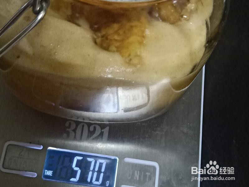 放入水果酵母,然后盖盖子晃匀了。说明书上说可以用温水调一下酵母的,不过我就直接放进去了,然后发现酵母不均匀,所以又拿了擀面杖把苹果稍微捣碎一点,出了苹果汁就很好晃匀了