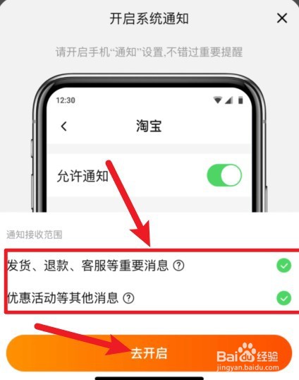 然后在消息界面里,在开启系统通知界面,勾选线上优惠的营销信息,点击去开启。