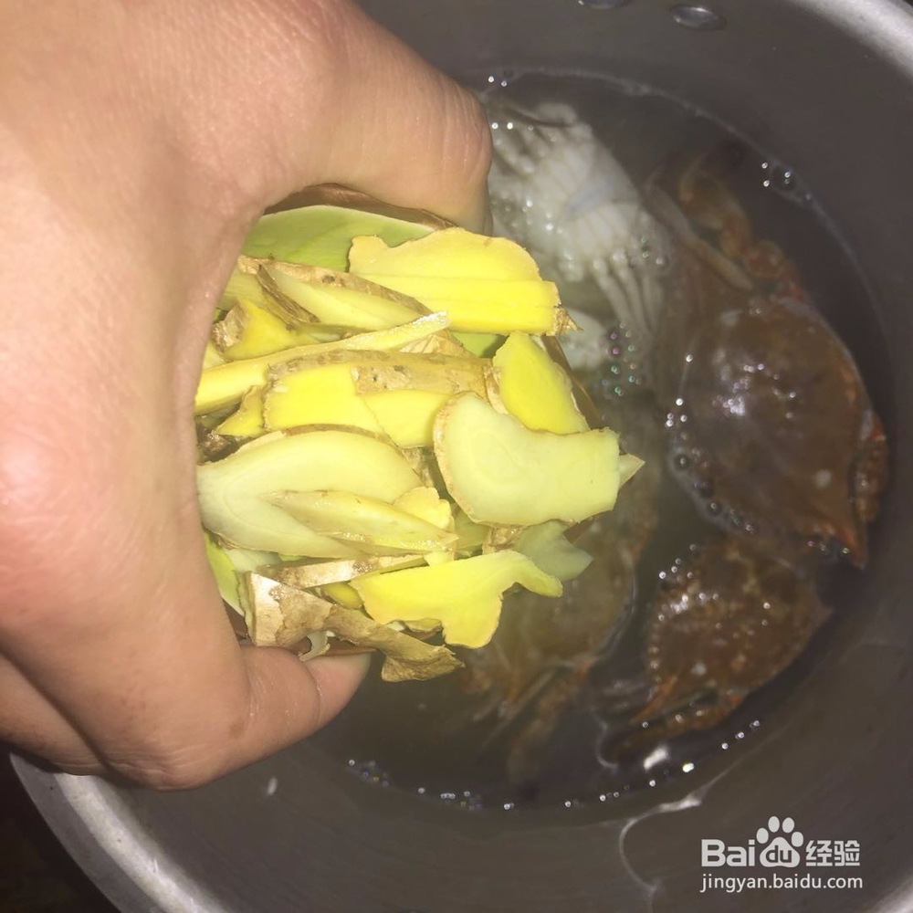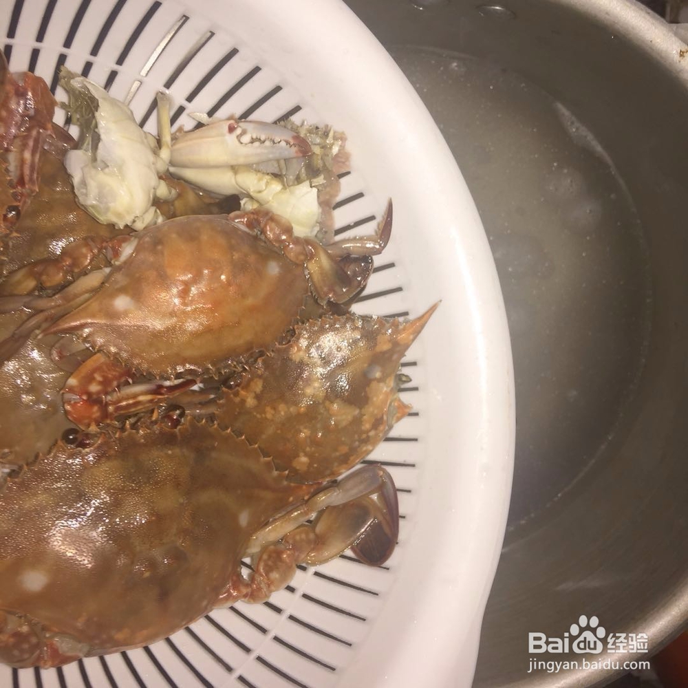 然后把处理好的螃蟹对半切开,锅中放入适量的清水,待水烧开,倒入螃蟹烫5分钟,捞出沥干。
