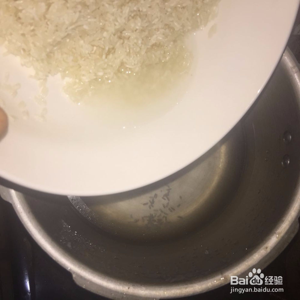 接着往高压锅中加入适量的清水,倒入泡好的大米。