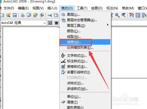 以Auto CAD 2008 为例,打开已经画好的CAD文件,选中你想改变线宽的线,点击工具栏上面的【格式】;