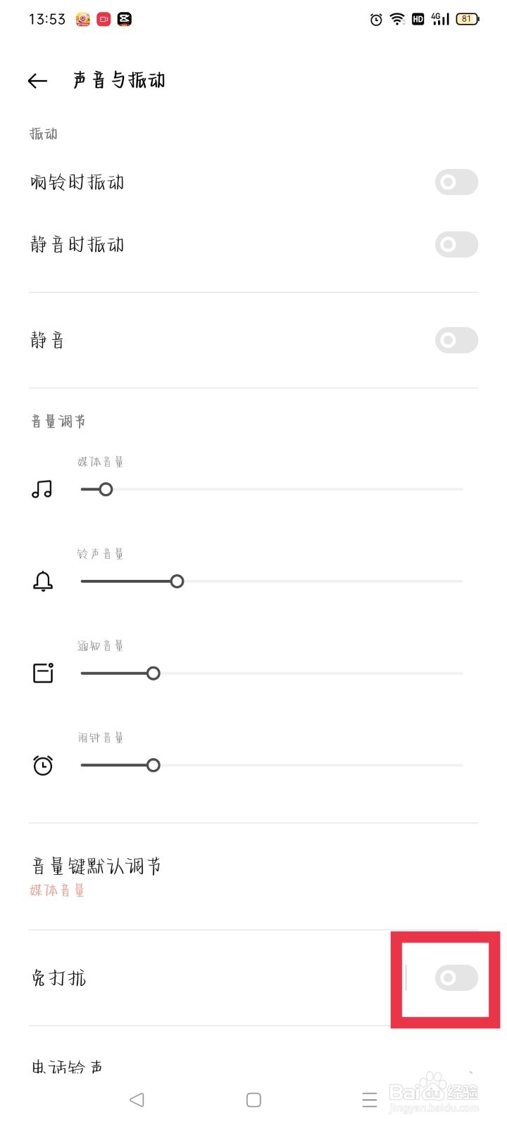 找到免打扰点击打开右侧的开关,当然你打开免打扰闹钟还是准时的响起的,它可以帮你隔绝掉其他的消息提示音。