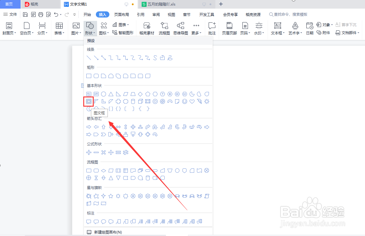 然后右击【插入】菜单下的【形状】,选择【图文框】图形