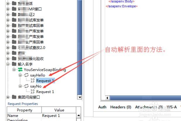 查看soapUI解析的服务端对外公布的方法。展开项目就可以看到服务类是:YouService,服务的方法有两个:sayHello 和 sayNo