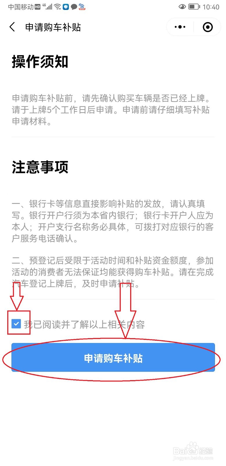 请详细阅读《操作须知》及《注意事项》,阅读后勾选左下角的复选项,点击“申请购车补贴”按钮。
