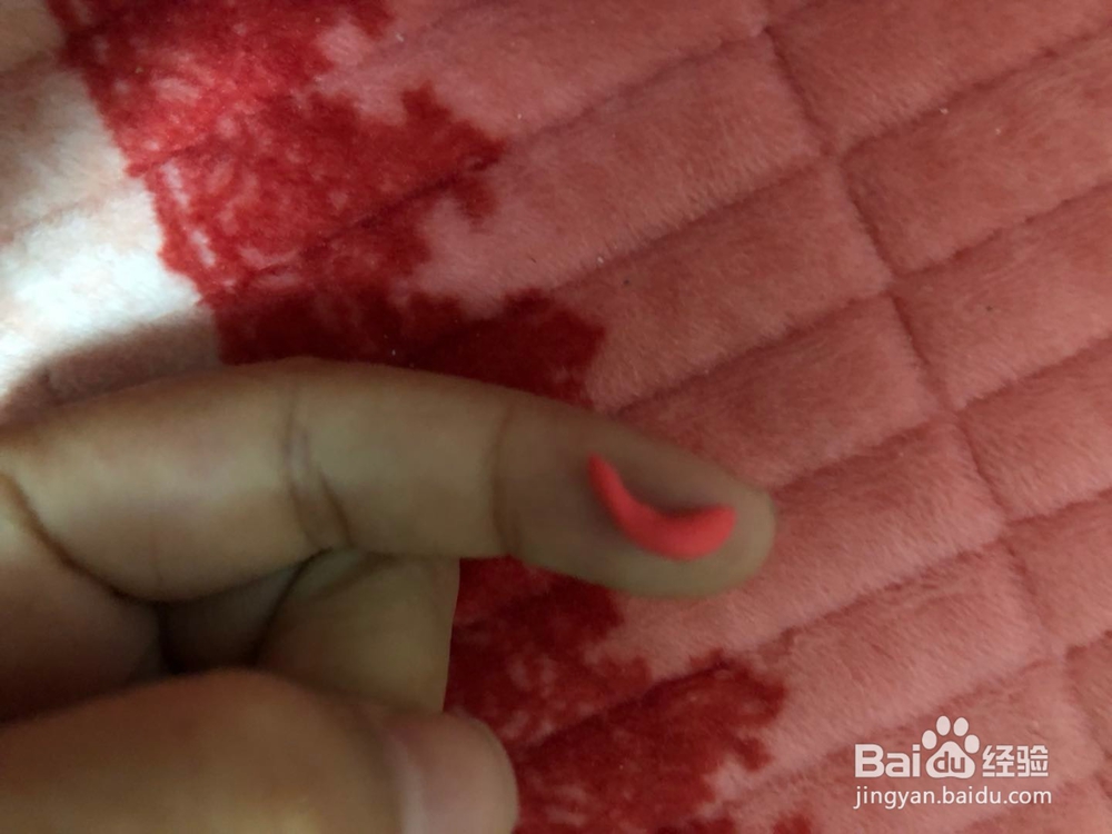 拿出红色的彩泥揉成V型,粘到脸上,在拿出蓝色的彩泥揉成圆柱型,一连接。
