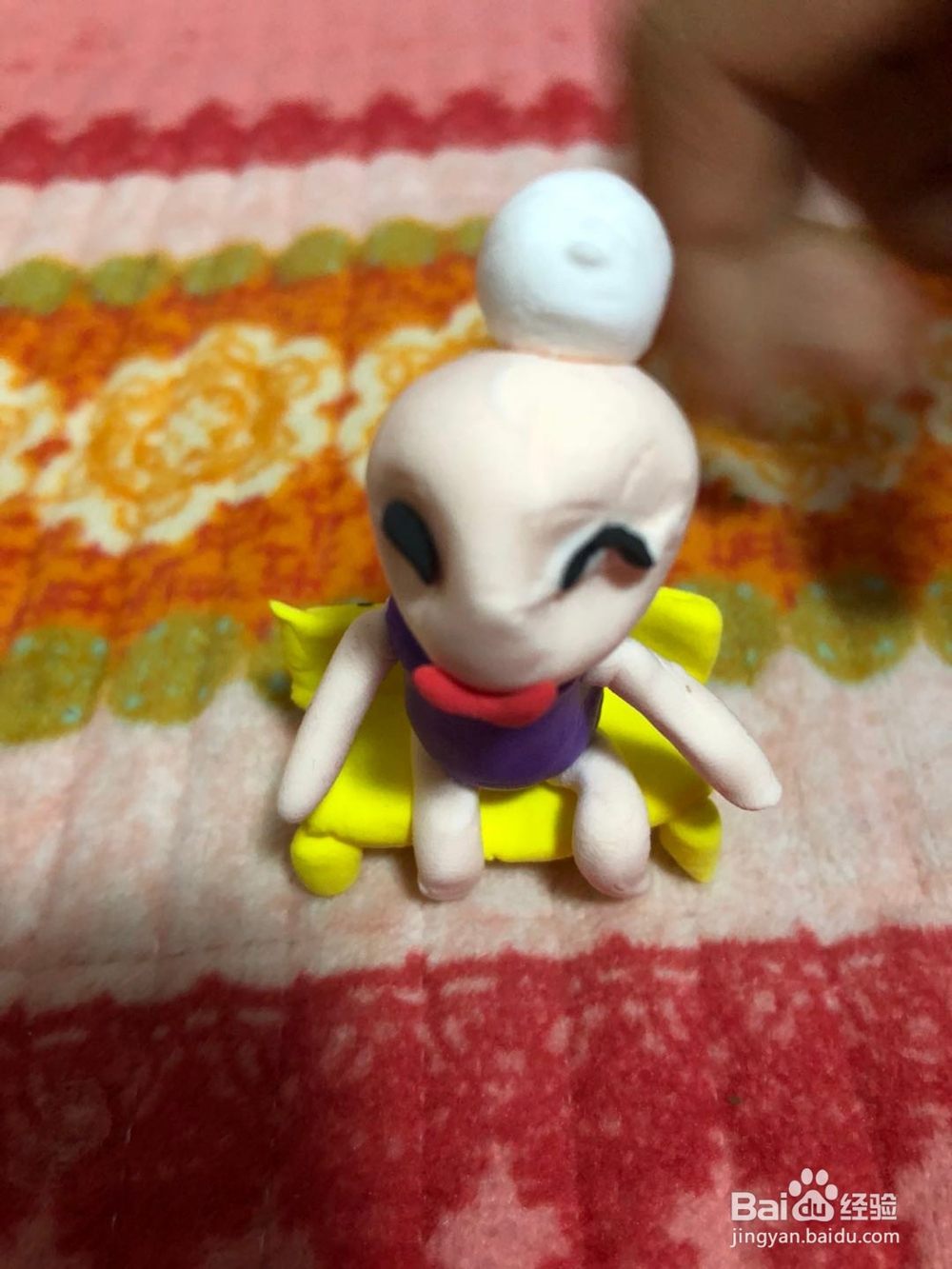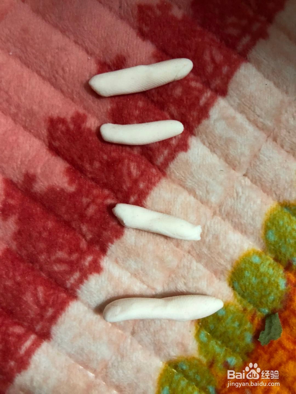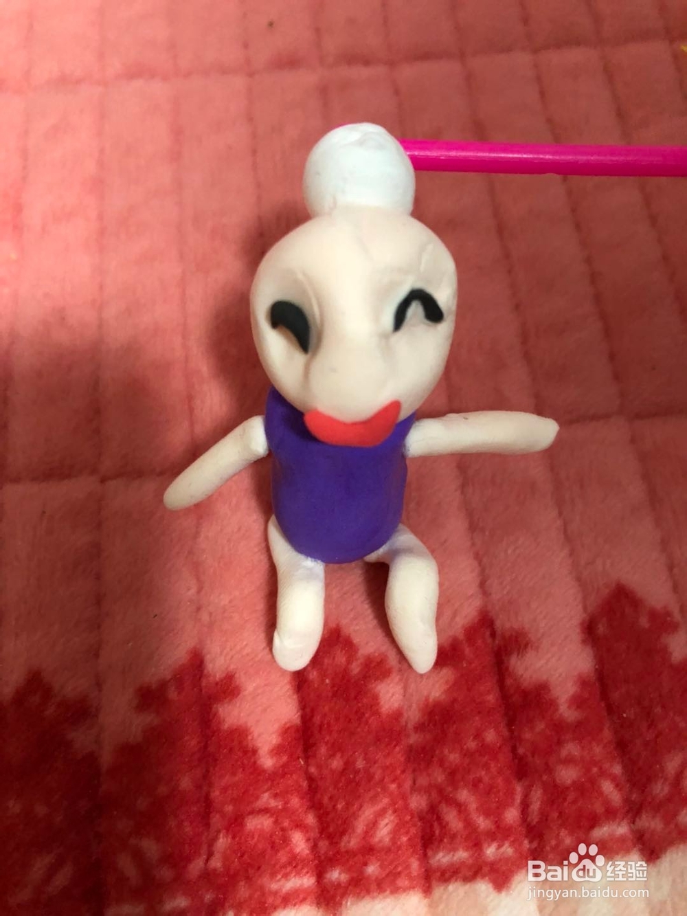 在拿出白色的彩泥揉成4个长条,粘到身体的两边,和下面,把腿弄弯。在拿出白色的彩泥揉成圆形,粘到头上。