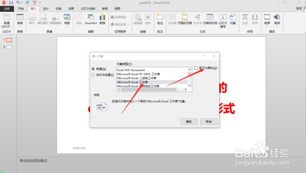 选择其中的“excel工作表”,同时找到“显示为图标”功能