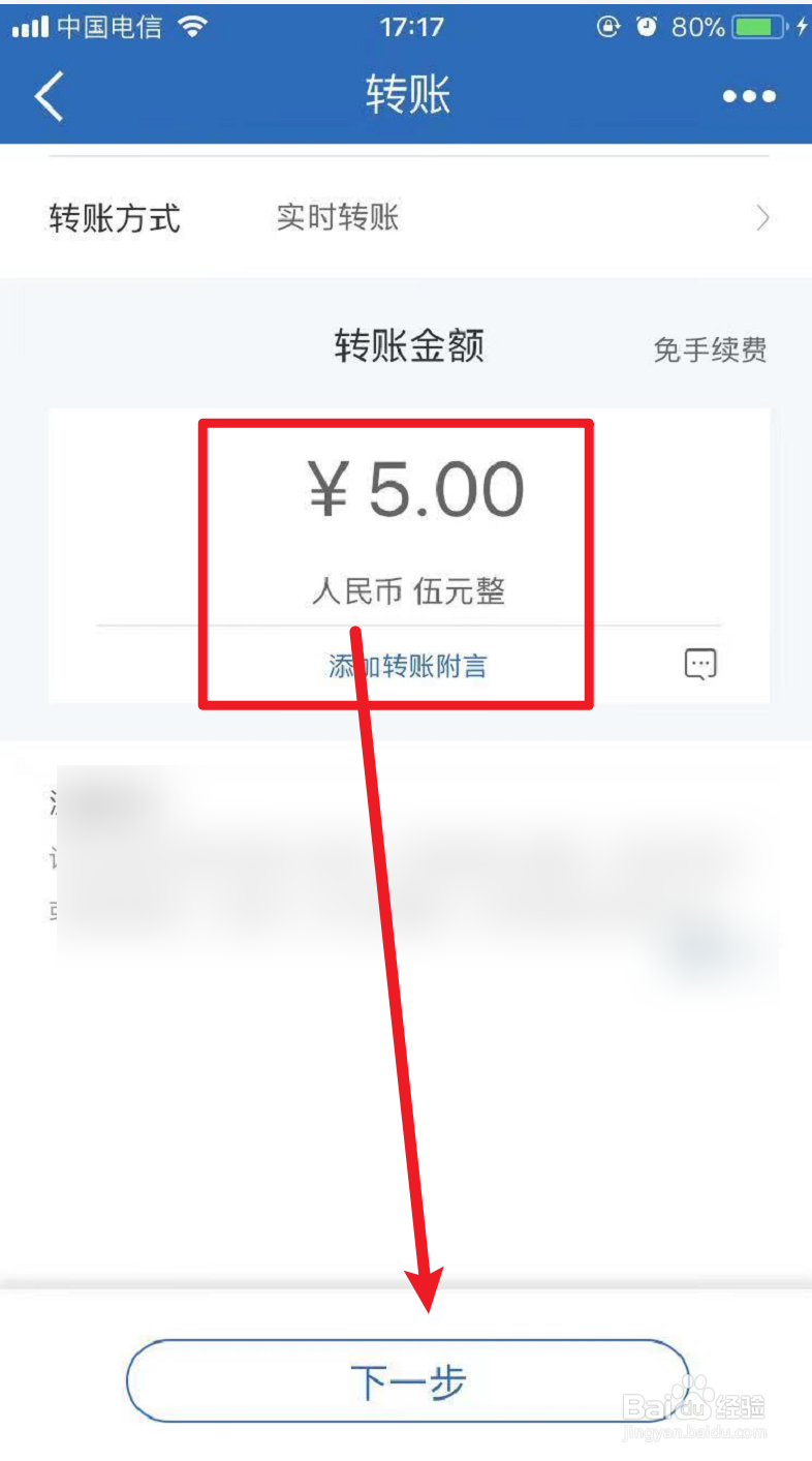 最后在转账界面选择要转回的账号,并输入转账金额,点击下一步进行转账即可。