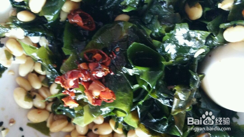 5.把泡发好的螺旋藻,黄豆都放碗里,加酱油,陈醋,盐,香油,蚝油,黑芝麻