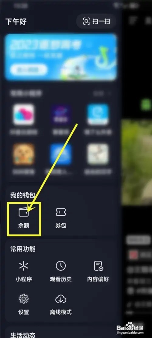 打开首页侧边栏,点击“余额”图标。