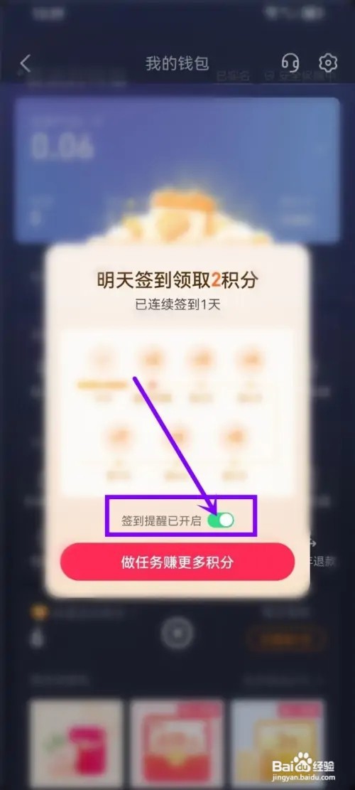 点击“签到提醒”开关按钮。
