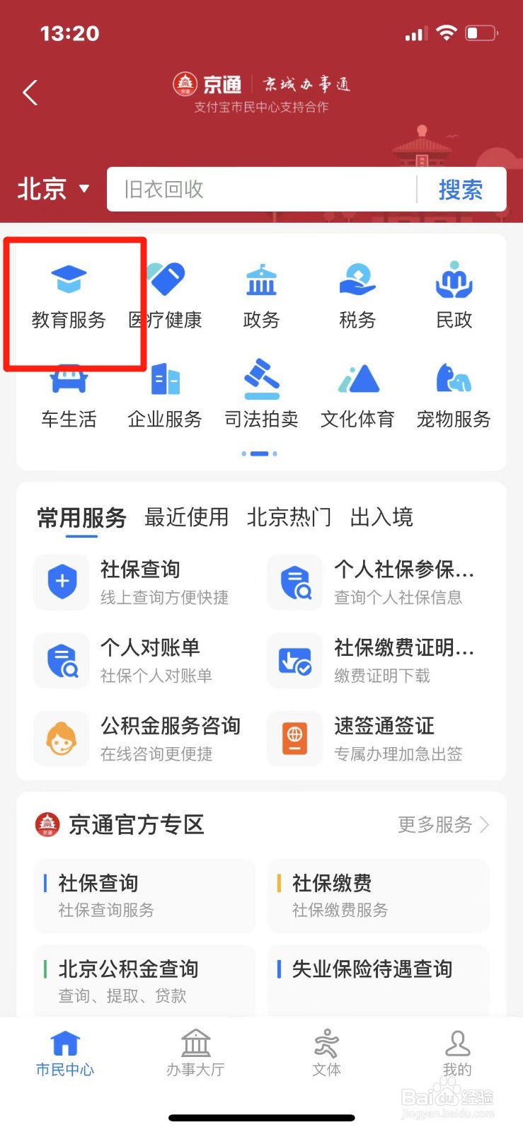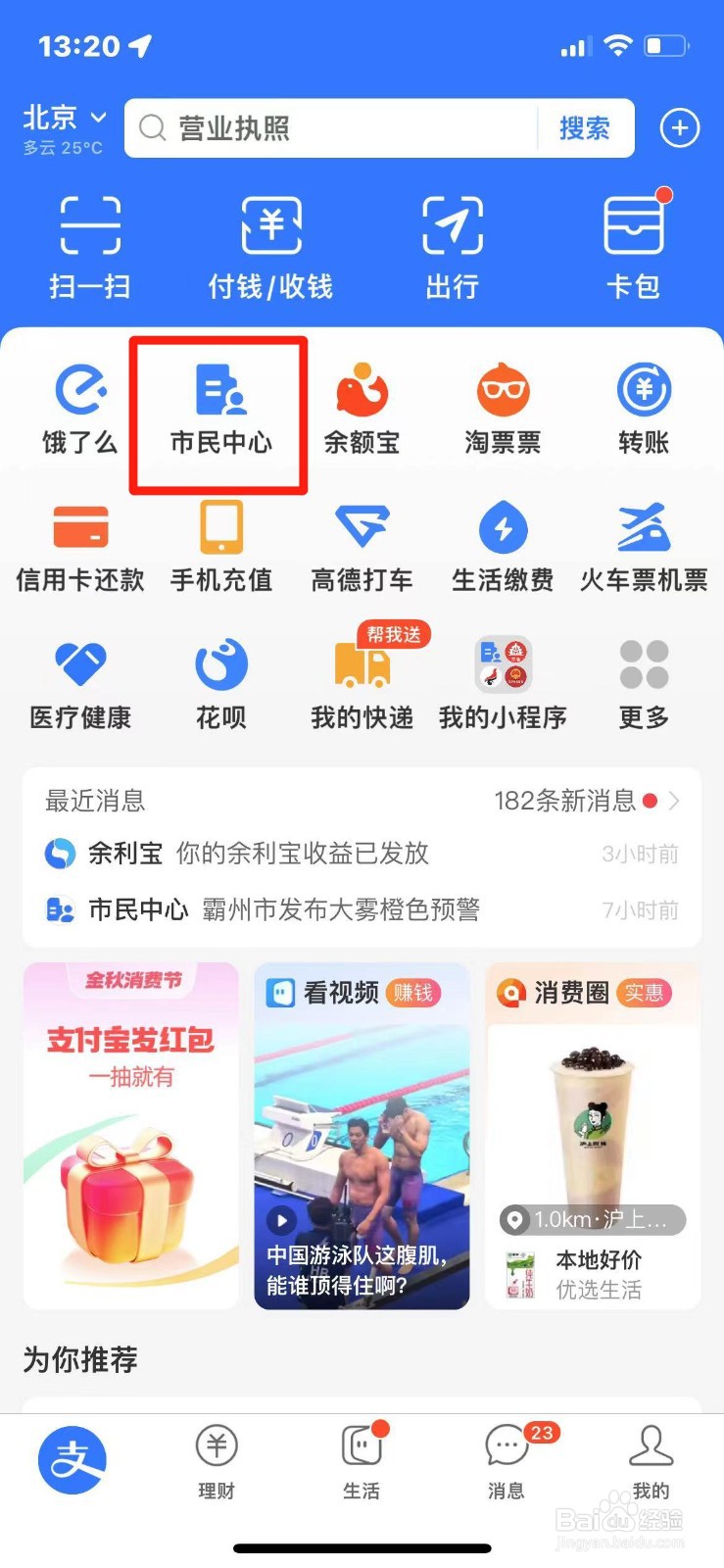 第一步:打开【支付宝】APP,点击【市民中心】。