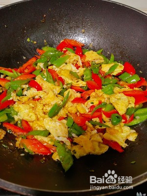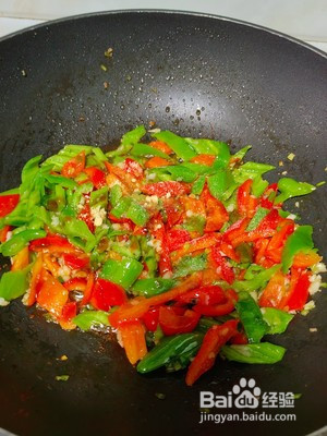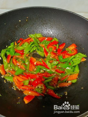 下入青红椒,炒至断生,加生抽,蚝油,盐,鸡粉。