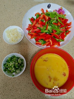 青红椒清洗干净切小块备用,葱切成葱花备用,蒜头拍扁切成蒜末备用,鸡蛋打入碗中搅散备用。