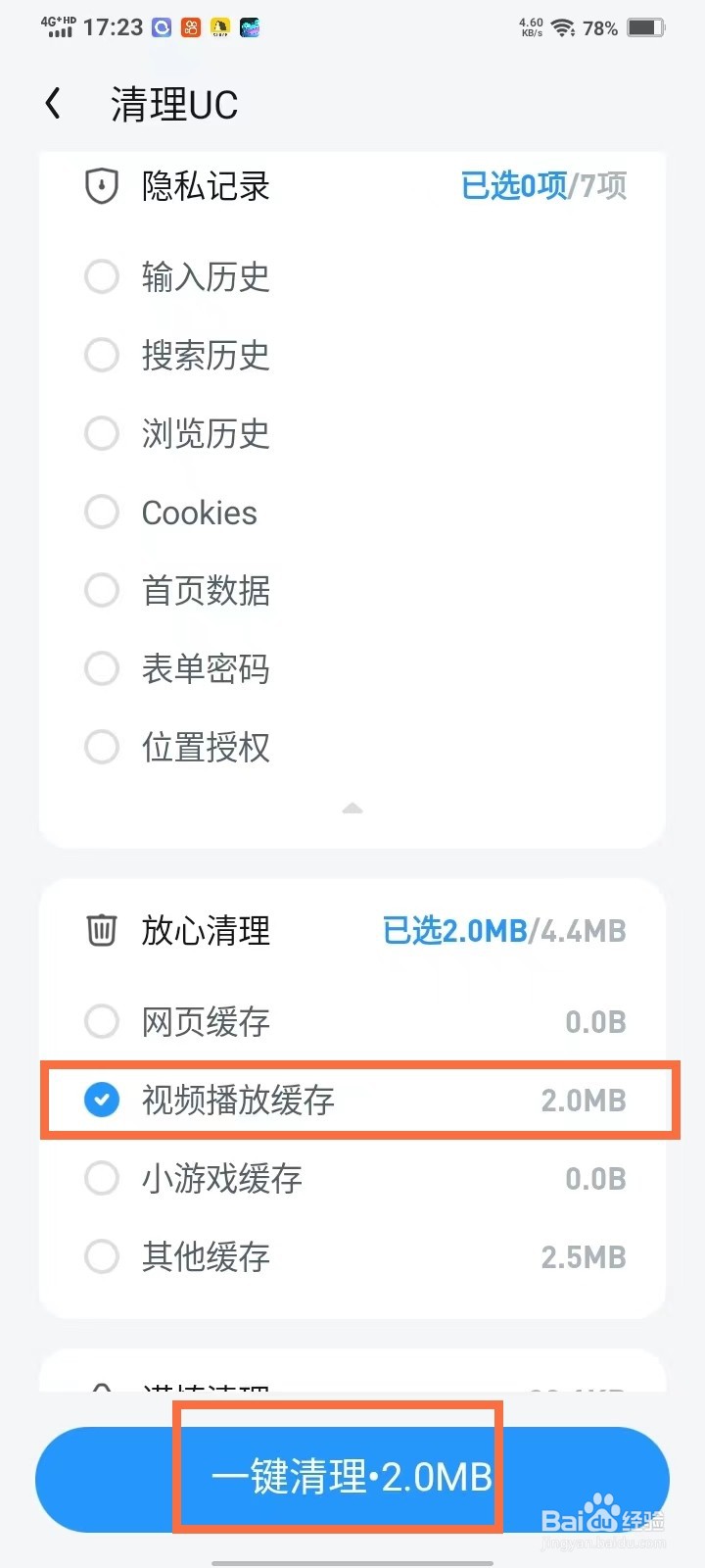 选择“视频播放缓存”选项,点击“清理”图标,即可删除看视频的缓存。