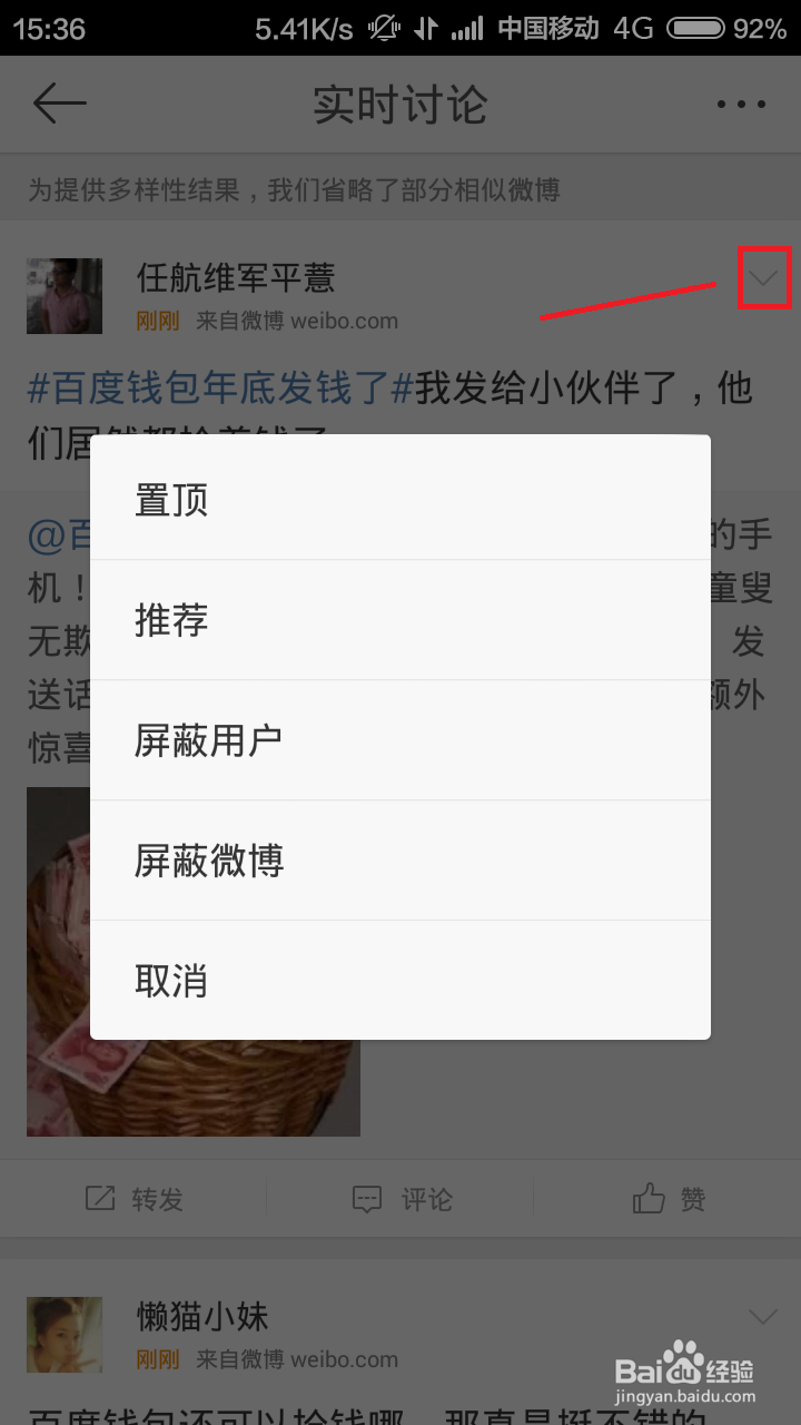 如果你觉得某一个用户的微博公然发布广告,就可以屏蔽该用户和他的微博,作为话题主持人,这点也是很重要的。