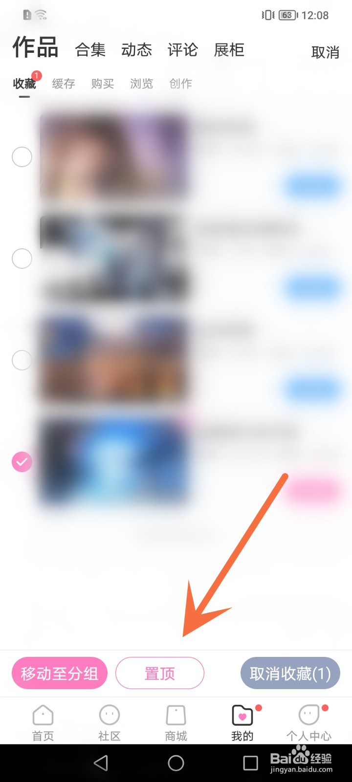 这时选择要置顶的作品,再点击【置顶】就可以了。