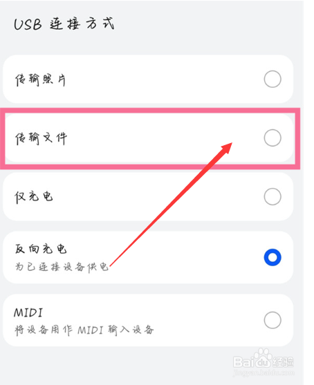 4、手机通过USB连接电脑后,在手机USB连接方式弹框中选择【传输文件】即可。