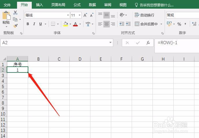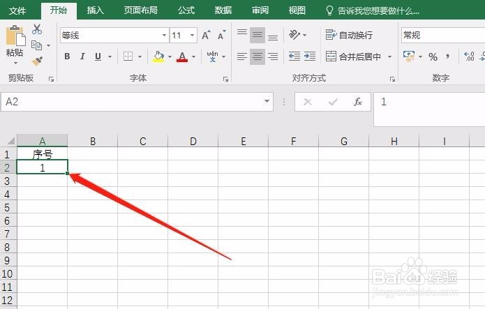 同样,首先在A2单元格先输入序列号1。然后选中A2单元格,鼠标点击A2单元格右下角的实心正方形。