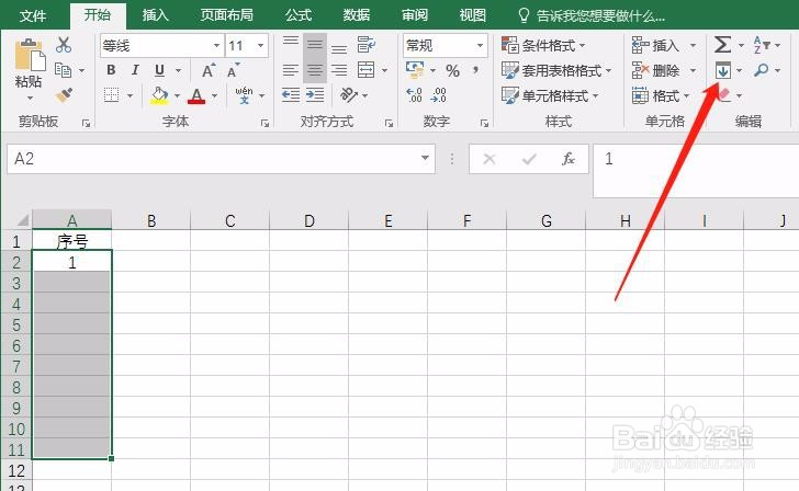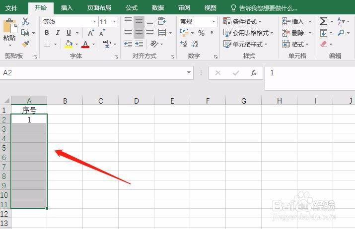 首先,在A2单元格输入1。接着,选中A2-A11单元格。