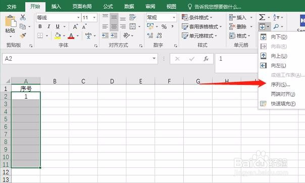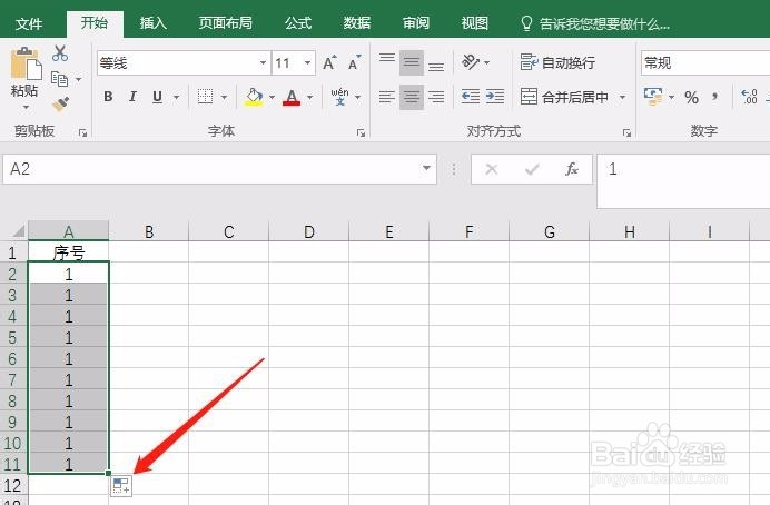 选择完成后,原来全部是1的单元格,现在变成了序列1-10。