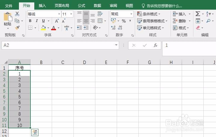 然后在A3单元格输入2,依次类推,完成序列号1-10的手动输入。