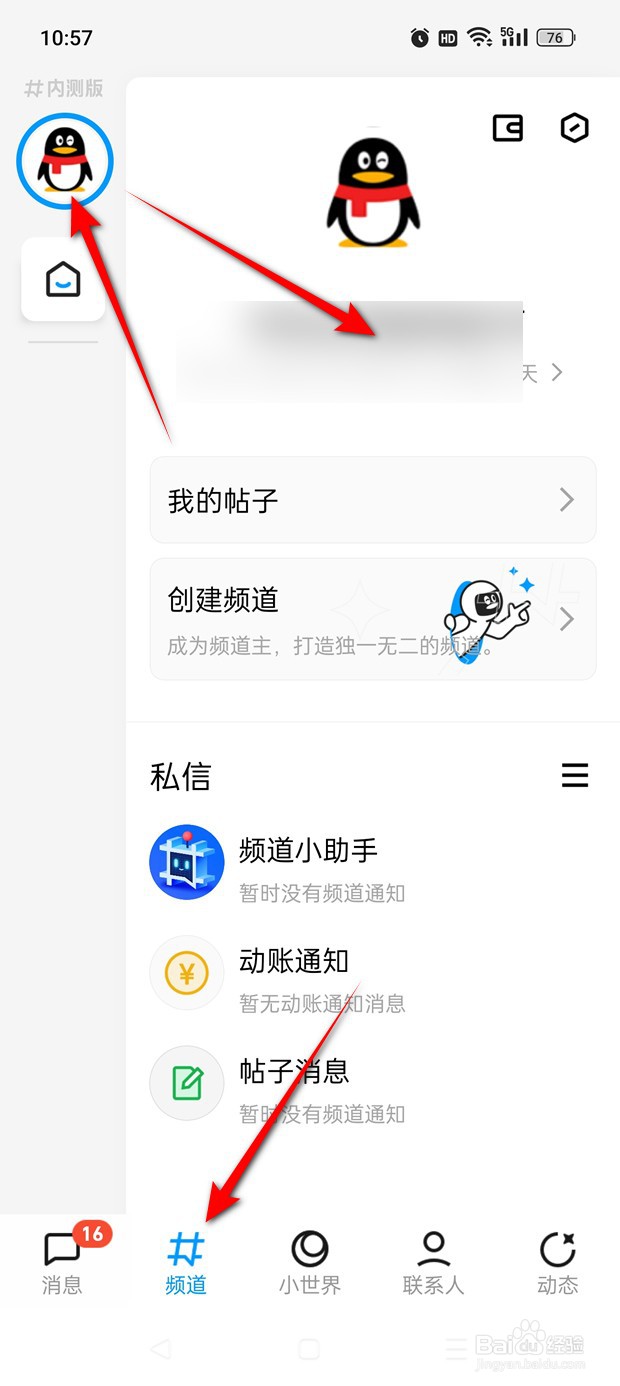 打开QQ“频道”页面,点选自己的QQ头像,点击用户信息展示区域。