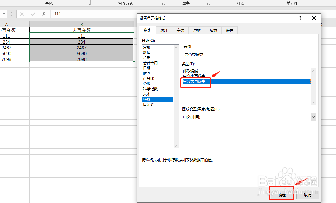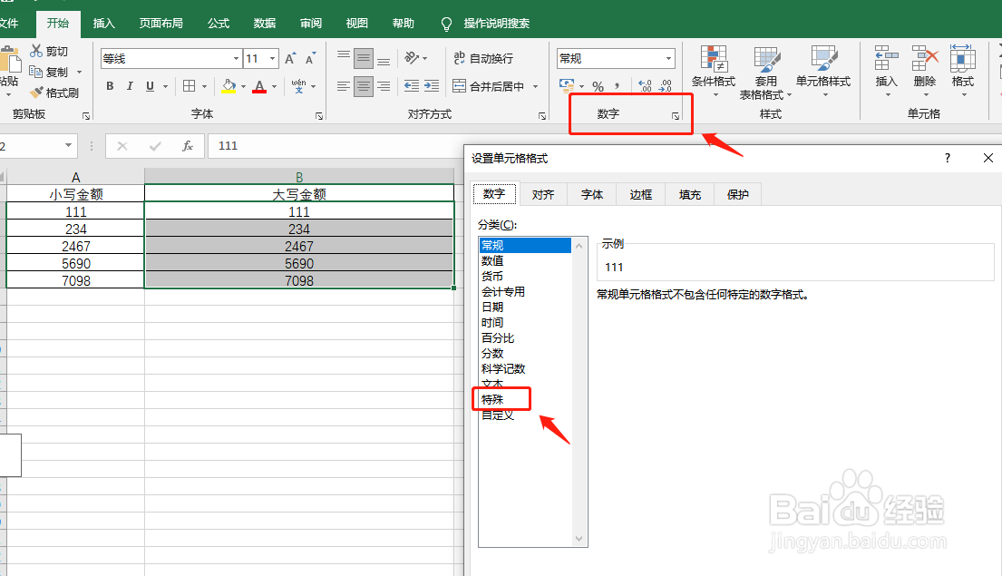 点击【开始】~【数字右下方小箭头】~【特殊】;