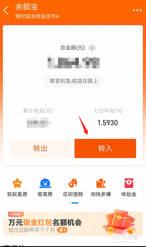 第四步,进入余额页面后,就能看到自己的支付宝账户余额,然后点击转入,输入转入的金额,此时要确定从哪个银行卡转入,点击确定;