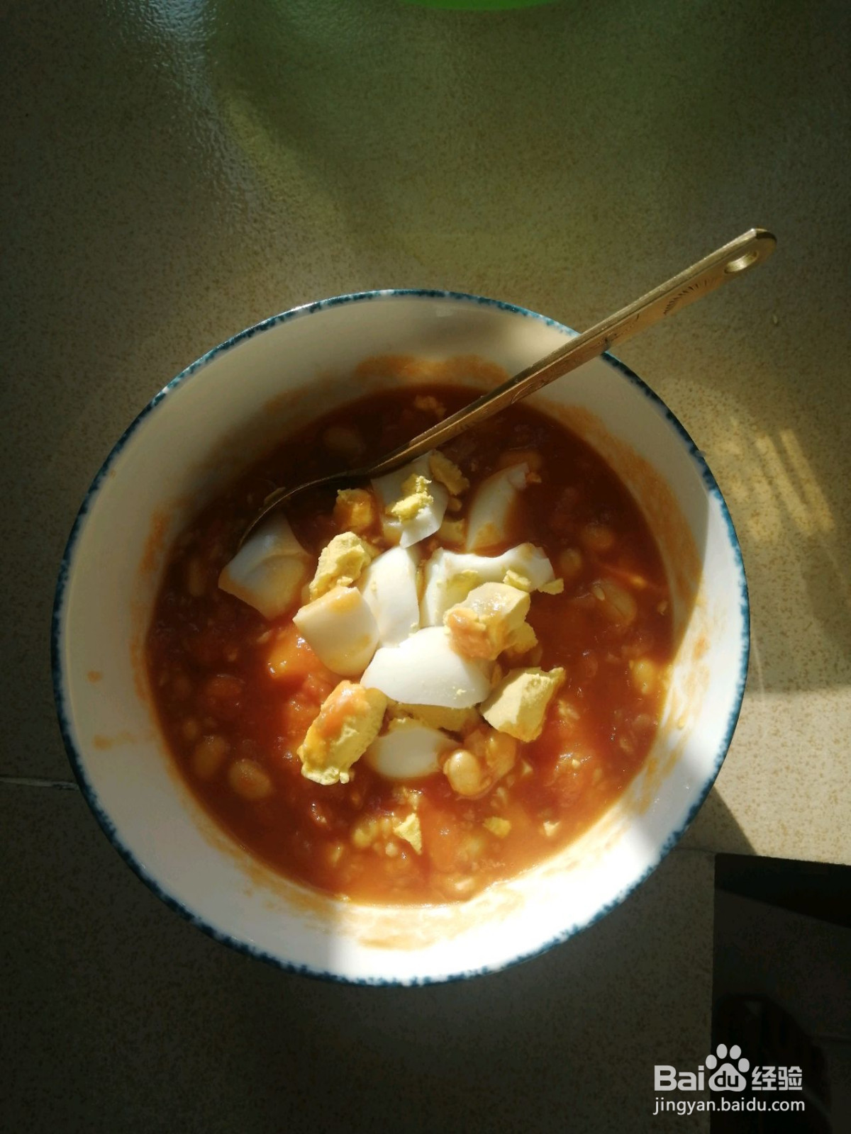 把之前煮好的蛋掰碎放进去。这时,你也可以放些你喜欢的佐料,比如香菜,葱花,莳萝等。 成品。忽略照片吧,拍得实在糟糕。成品不错。这味道,你试过一定不会忘记的。