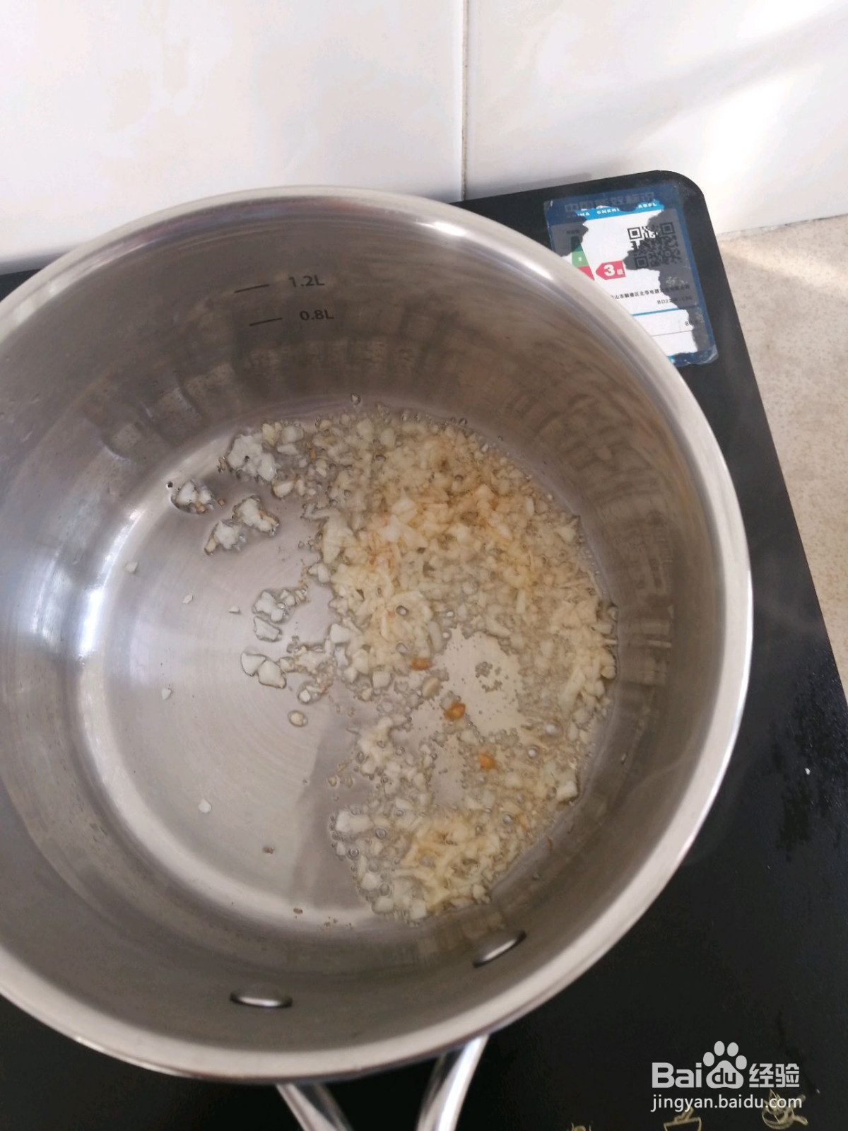 下黄油,没有可以用食用油代替,把切碎的蒜头放进去炒。这一步也可以用洋葱代替,也是少许切碎炒制,洋葱和西红柿也是绝配的,配制的风味也是绝佳。