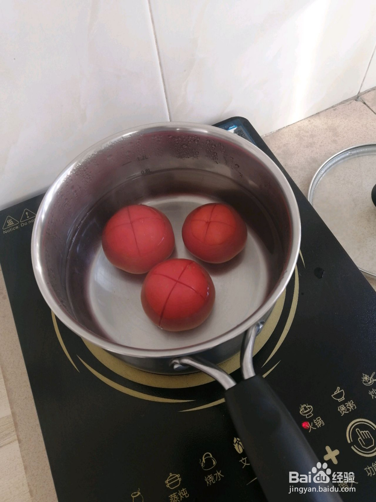 在西红柿底部划十字刀,开水烫10分钟去皮。你要嫌慢,可以水开了,小火煮一会儿。