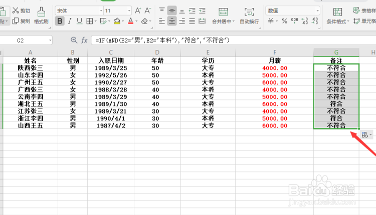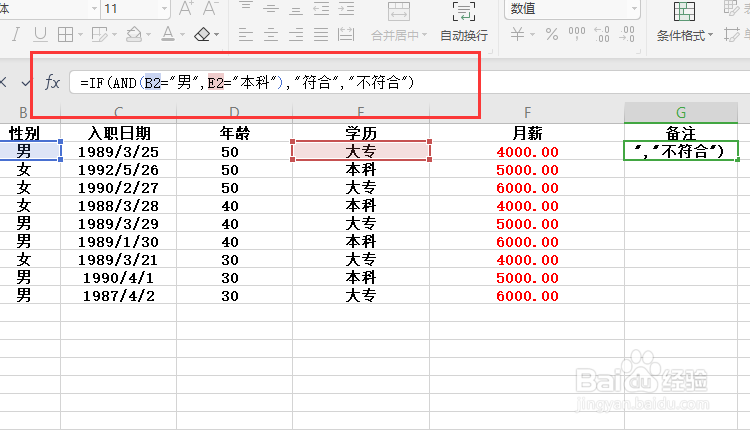 输入函数"IF(AND(B2="男",E2="本科"),"符合","不符合")"。