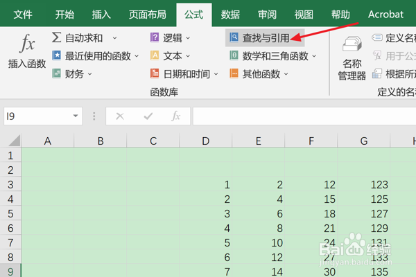 在“函数库”组中,点击“查找与引用”下拉按钮。